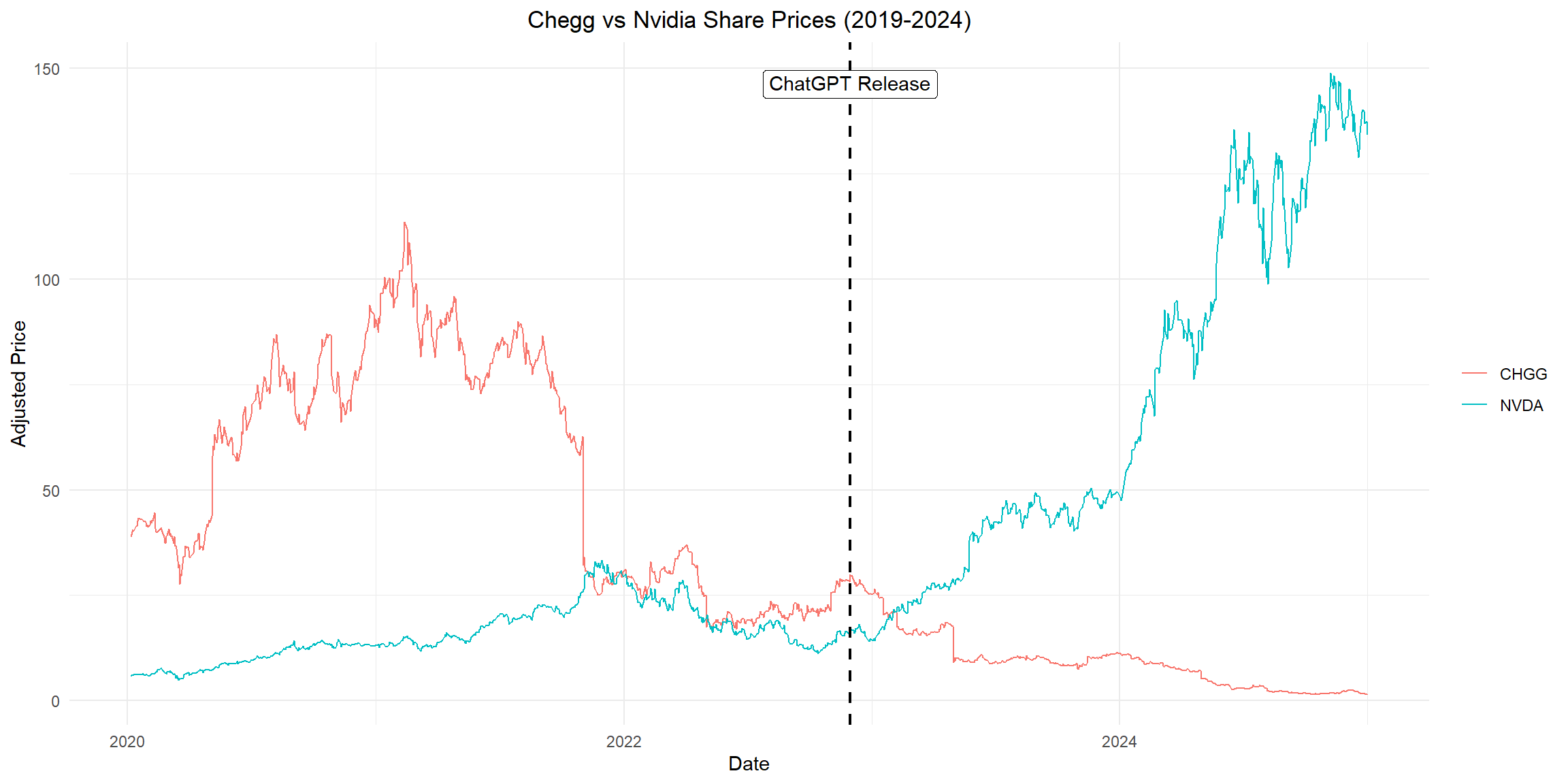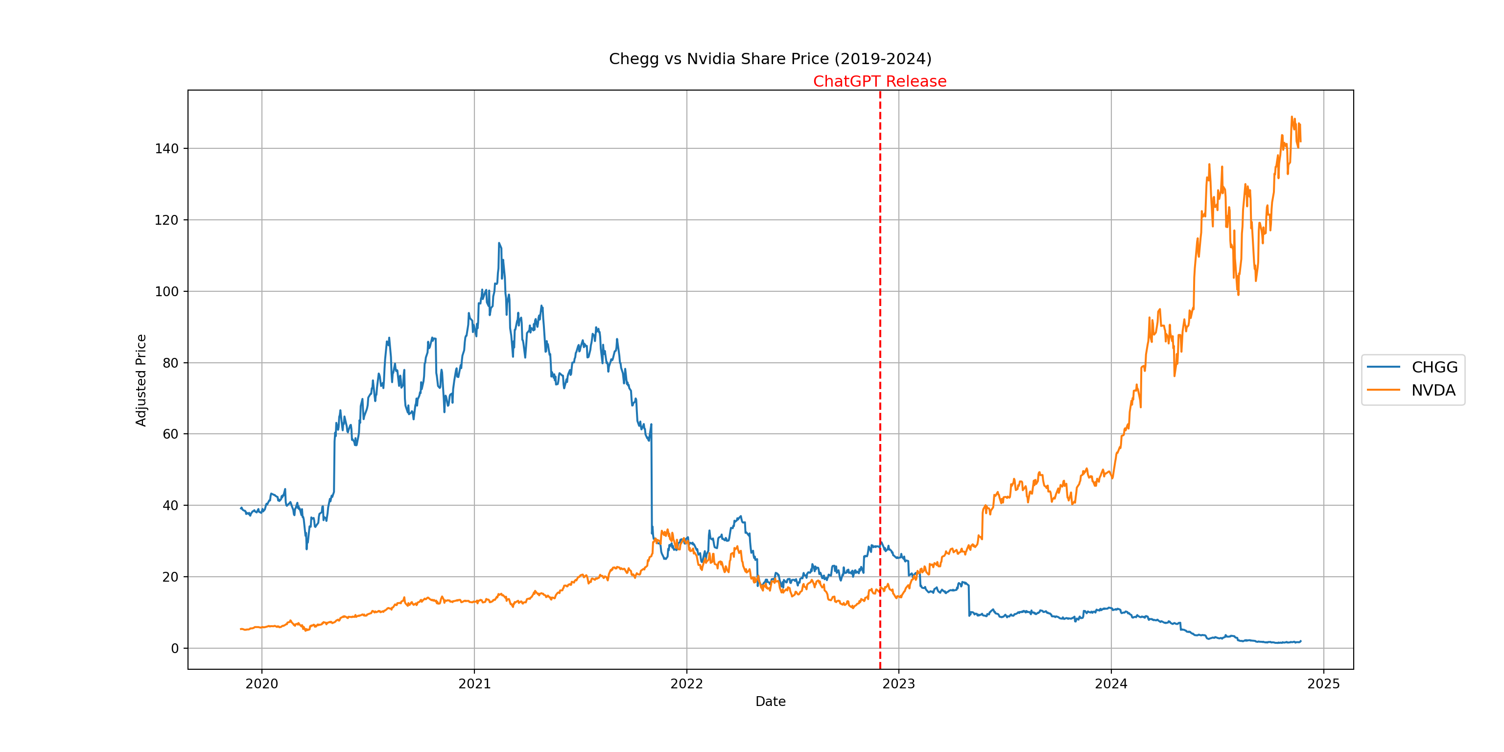ChaptGPT was released on November 30, 2022. Here I compare the share price of Nvidia and Chegg for five years, which cover some period before the release of ChatGPT and some period after the release of ChatGPT.